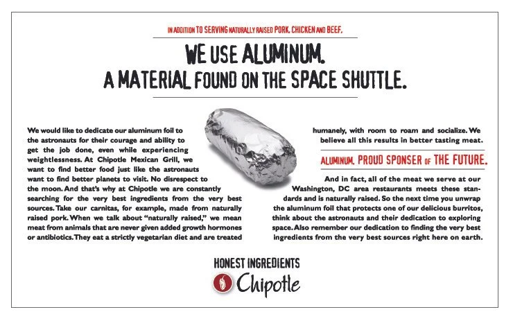 Despite being a national food chain, Chipotle Mexican Grill sources their meats and vegetables from small, family-owned farms. Today, they're the largest buyer of naturally raised foods in the country. To help support their dedication to healthier fast-casual, the irreverent yet brutally honest ingredients were born.